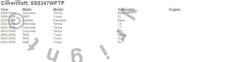 Below is an abbreviated list of applications for the SeatSaver Custom Seat Cover.Escalade, Tahoe, Yukon, Cadillac, Chevrolet, GMC, 2006, 2005, 2004, 2003