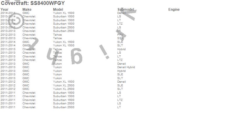 Below is an abbreviated list of applications for the SeatSaver Custom Seat Cover.Suburban 1500, Suburban 2500, Tahoe, Yukon, Yukon XL 1500, Yukon XL 2500, Chevrolet, GMC, 2014, 2013, 2012, 2011