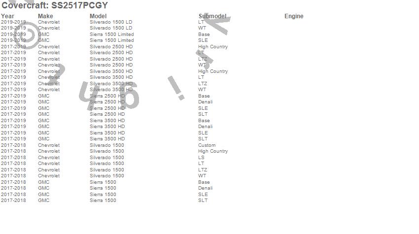 Below is an abbreviated list of applications for the SeatSaver Custom Seat Cover.Sierra 1500, Sierra 1500 Limited, Sierra 2500 HD, Sierra 3500 HD, Silverado 1500, Silverado 1500 LD, Silverado 2500 HD, Silverado 3500 HD, Chevrolet, GMC, 2019, 2018, 2017