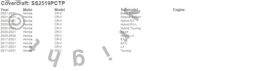 Below is an abbreviated list of applications for the SeatSaver Custom Seat Cover.CR-V, Honda, 2021, 2020, 2019, 2018, 2017
