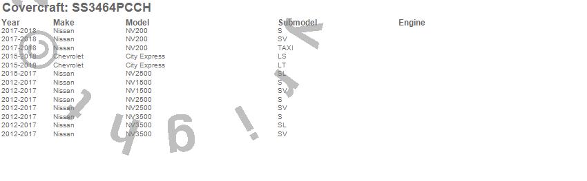 Below is an abbreviated list of applications for the SeatSaver Custom Seat Cover.City Express, NV1500, NV200, NV2500, NV3500, Chevrolet, Nissan, 2018, 2017, 2016, 2015, 2014, 2013, 2012