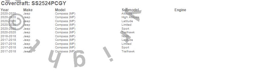 Below is an abbreviated list of applications for the SeatSaver Custom Seat Cover.Compass, Jeep, 2020, 2018, 2017