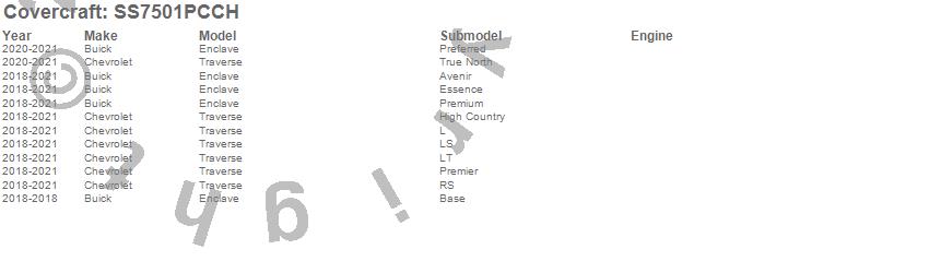 Below is an abbreviated list of applications for the SeatSaver Custom Seat Cover.Enclave, Traverse, Buick, Chevrolet, 2021, 2020, 2019, 2018