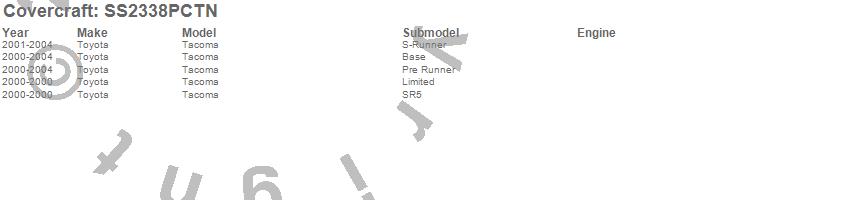 Below is an abbreviated list of applications for the SeatSaver Custom Seat Cover.Tacoma, Toyota, 2004, 2003, 2002, 2001, 2000