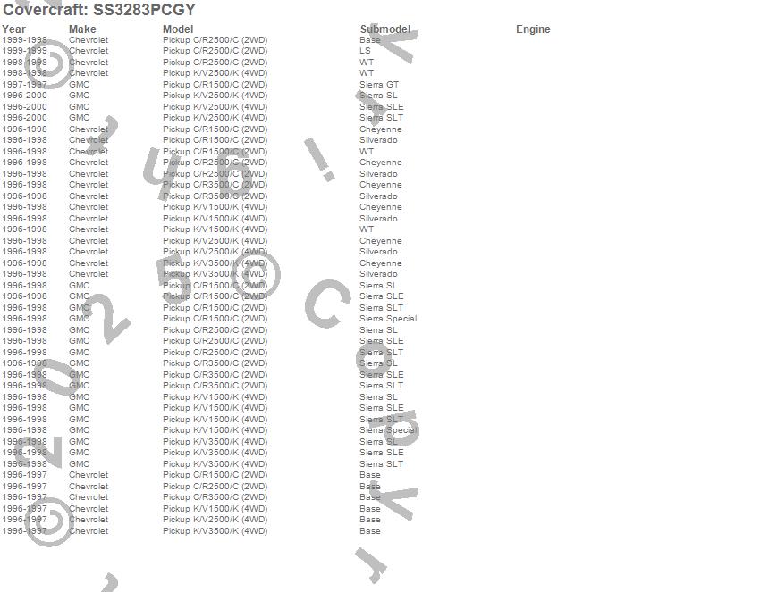 Below is an abbreviated list of applications for the SeatSaver Custom Seat Cover.C1500 Pickup, C2500 Pickup, C3500 Pickup, K1500 Pickup, K2500 Pickup, K3500 Pickup, Chevrolet, GMC, 2000, 1999, 1998, 1997, 1996