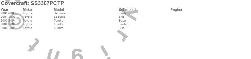 Below is an abbreviated list of applications for the SeatSaver Custom Seat Cover.Sequoia, Tundra, Toyota, 2004, 2003, 2002, 2001, 2000