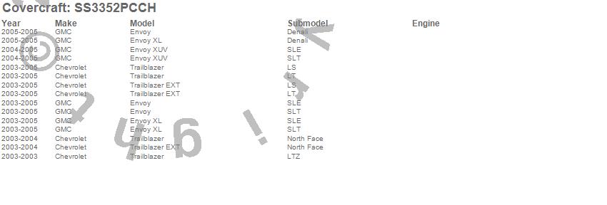 Below is an abbreviated list of applications for the SeatSaver Custom Seat Cover.Envoy, Envoy XL, Envoy XUV, Trailblazer, Trailblazer EXT, Chevrolet, GMC, 2005, 2004, 2003