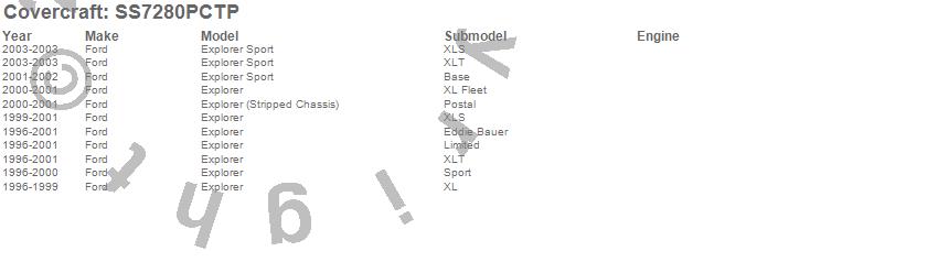 Below is an abbreviated list of applications for the SeatSaver Custom Seat Cover.Explorer, Explorer (Stripped Chassis), Explorer Sport, Ford, 2003, 2002, 2001, 2000, 1999, 1998, 1997, 1996