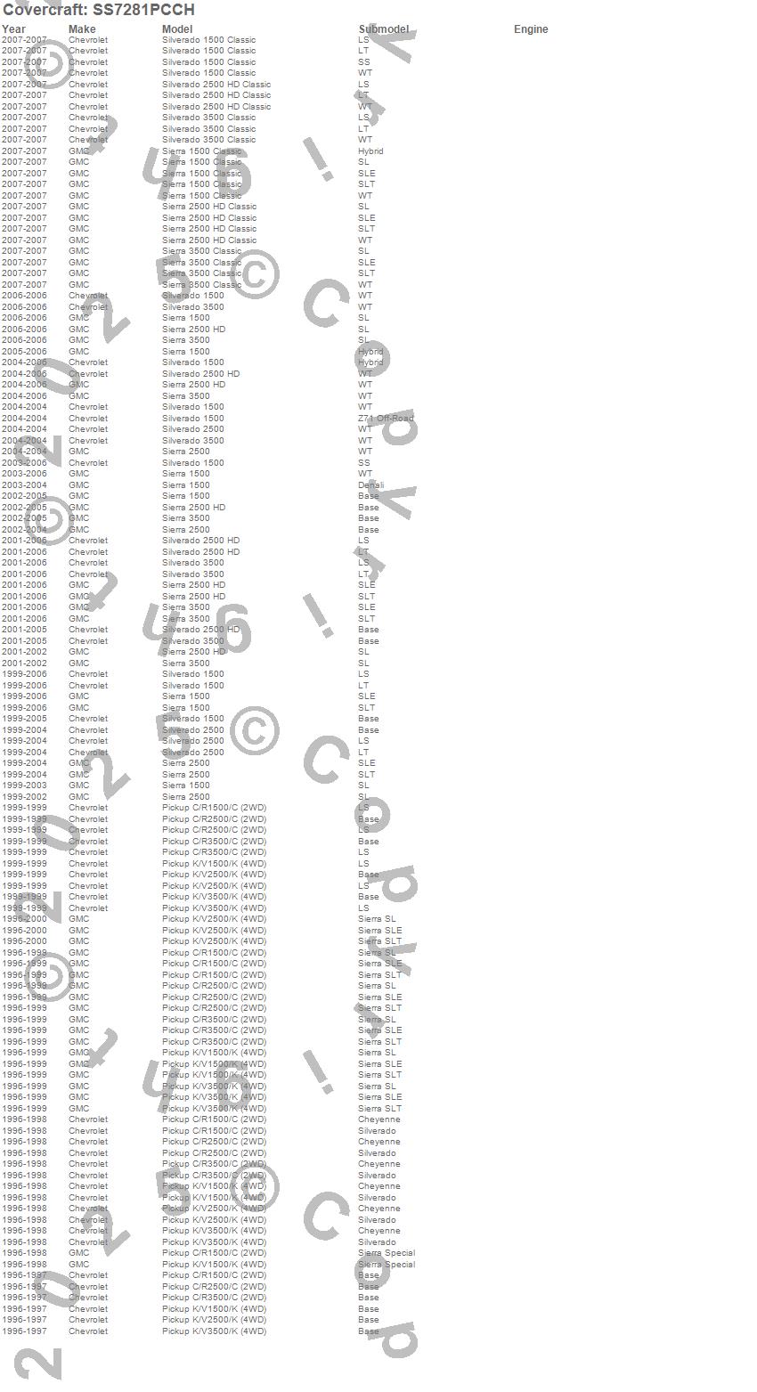 Below is an abbreviated list of applications for the SeatSaver Custom Seat Cover.C1500 Pickup, C2500 Pickup, C3500 Pickup, K1500 Pickup, K2500 Pickup, K3500 Pickup, Sierra 1500, Sierra 1500 Classic, Sierra 2500, Sierra 2500 HD, Sierra 2500 HD Classic, Sierra 3500, Sierra 3500 Classic, Silverado 1500, Silverado 1500 Classic, Silverado 2500, Silverado 2500 HD, Silverado 2500 HD Classic, Silverado 3500, Silverado 3500 Classic