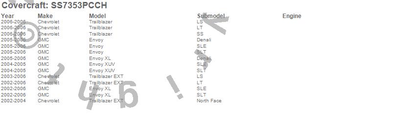 Below is an abbreviated list of applications for the SeatSaver Custom Seat Cover.Envoy, Envoy XL, Envoy XUV, Trailblazer, Trailblazer EXT, Chevrolet, GMC, 2006, 2005, 2004, 2003, 2002