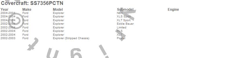 Below is an abbreviated list of applications for the SeatSaver Custom Seat Cover.Explorer, Explorer (Stripped Chassis), Ford, 2004, 2003, 2002