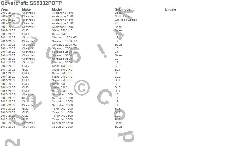 Below is an abbreviated list of applications for the SeatSaver Custom Seat Cover.Avalanche 1500, Avalanche 2500, Sierra 1500 HD, Sierra 2500 HD, Sierra 3500, Silverado 1500 HD, Silverado 2500 HD, Silverado 3500, Suburban 1500, Suburban 2500, Yukon XL 1500, Yukon XL 2500, Chevrolet, GMC, 2002, 2001, 2000