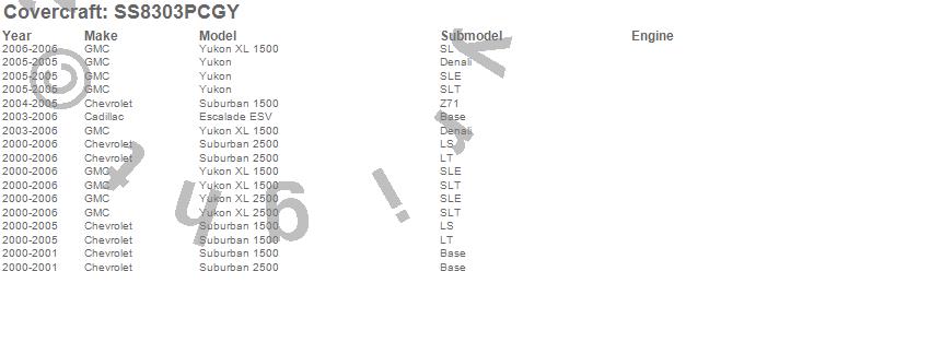 Below is an abbreviated list of applications for the SeatSaver Custom Seat Cover.Escalade ESV, Suburban 1500, Suburban 2500, Yukon, Yukon XL 1500, Yukon XL 2500, Cadillac, Chevrolet, GMC, 2006, 2005, 2004, 2003, 2002, 2001, 2000