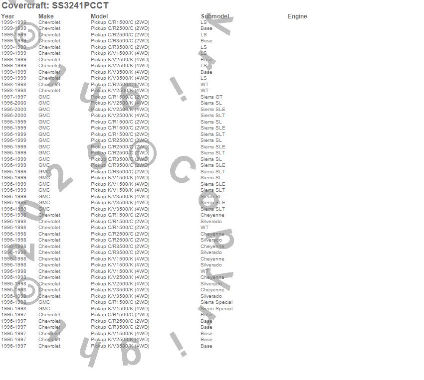 Below is an abbreviated list of applications for the SeatSaver Custom Seat Cover.C1500 Pickup, C2500 Pickup, C3500 Pickup, K1500 Pickup, K2500 Pickup, K3500 Pickup, Chevrolet, GMC, 2000, 1999, 1998, 1997, 1996
