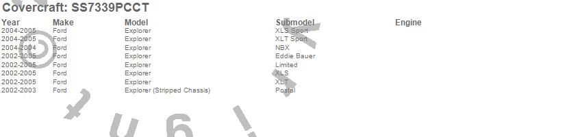 Below is an abbreviated list of applications for the SeatSaver Custom Seat Cover.Explorer, Explorer (Stripped Chassis), Ford, 2005, 2004, 2003, 2002