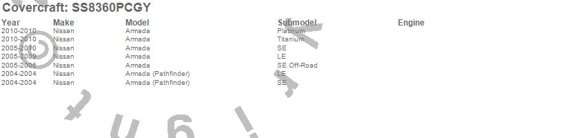 Below is an abbreviated list of applications for the SeatSaver Custom Seat Cover.Armada, Armada (Pathfinder), Nissan, 2010, 2009, 2008, 2007, 2006, 2005, 2004
