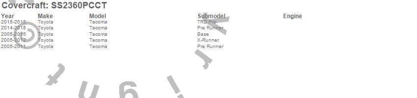 Below is an abbreviated list of applications for the SeatSaver Custom Seat Cover.Tacoma, Toyota, 2015, 2014, 2013, 2012, 2011, 2010, 2009, 2008, 2007, 2006, 2005