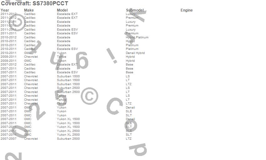 Below is an abbreviated list of applications for the SeatSaver Custom Seat Cover.Escalade, Escalade ESV, Escalade EXT, Suburban 1500, Suburban 2500, Tahoe, Yukon, Yukon XL 1500, Yukon XL 2500, Cadillac, Chevrolet, GMC, 2012, 2011, 2010, 2009, 2008, 2007