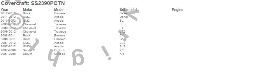 Below is an abbreviated list of applications for the SeatSaver Custom Seat Cover.Acadia, Enclave, Outlook, Traverse, Buick, Chevrolet, GMC, Saturn, 2012, 2011, 2010, 2009, 2008, 2007