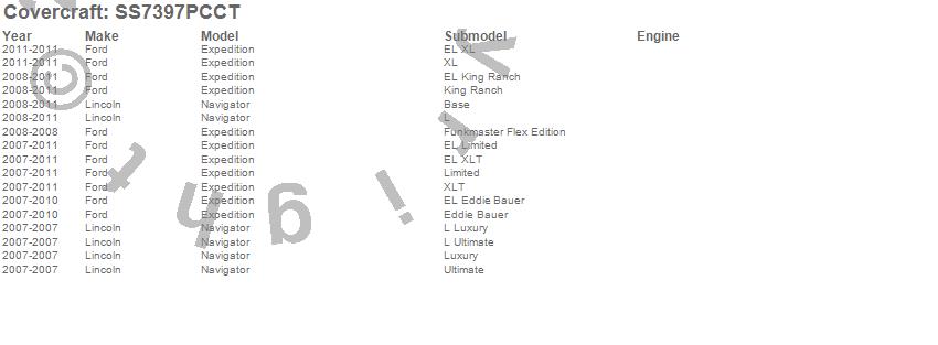 Below is an abbreviated list of applications for the SeatSaver Custom Seat Cover.Expedition, Navigator, Ford, Lincoln, 2011, 2010, 2009, 2008, 2007
