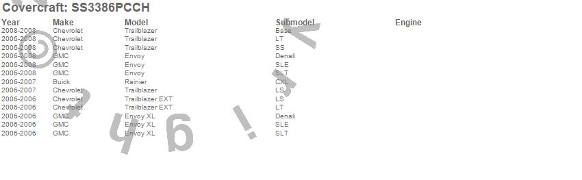 Below is an abbreviated list of applications for the SeatSaver Custom Seat Cover.Envoy, Envoy XL, Rainier, Trailblazer, Trailblazer EXT, Buick, Chevrolet, GMC, 2008, 2007, 2006