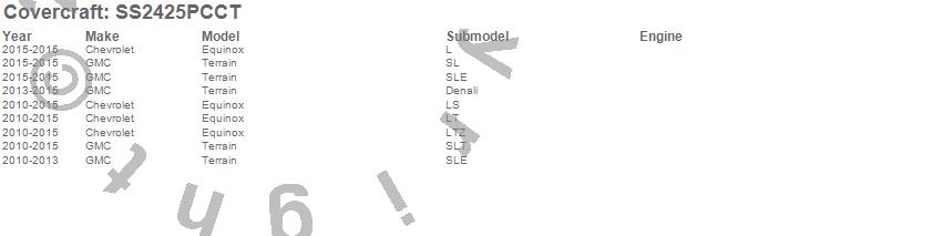 Below is an abbreviated list of applications for the SeatSaver Custom Seat Cover.Equinox, Terrain, Chevrolet, GMC, 2015, 2014, 2013, 2012, 2011, 2010