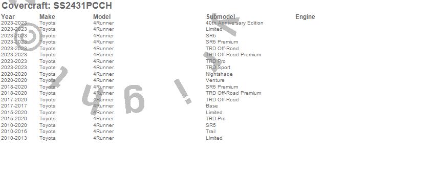 Below is an abbreviated list of applications for the SeatSaver Custom Seat Cover.4Runner, Toyota, 2024, 2023, 2020, 2019, 2018, 2017, 2016, 2015, 2014, 2013, 2012, 2011, 2010