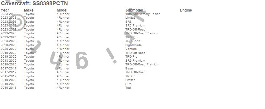 Below is an abbreviated list of applications for the SeatSaver Custom Seat Cover.4Runner, Toyota, 2024, 2023, 2020, 2019, 2018, 2017, 2016, 2015, 2014, 2013, 2012, 2011, 2010
