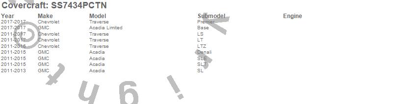 Below is an abbreviated list of applications for the SeatSaver Custom Seat Cover.Acadia, Acadia Limited, Traverse, Chevrolet, GMC, 2017, 2016, 2015, 2014, 2013, 2012, 2011