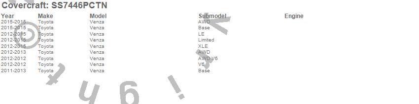 Below is an abbreviated list of applications for the SeatSaver Custom Seat Cover.Venza, Toyota, 2015, 2014, 2013, 2012, 2011