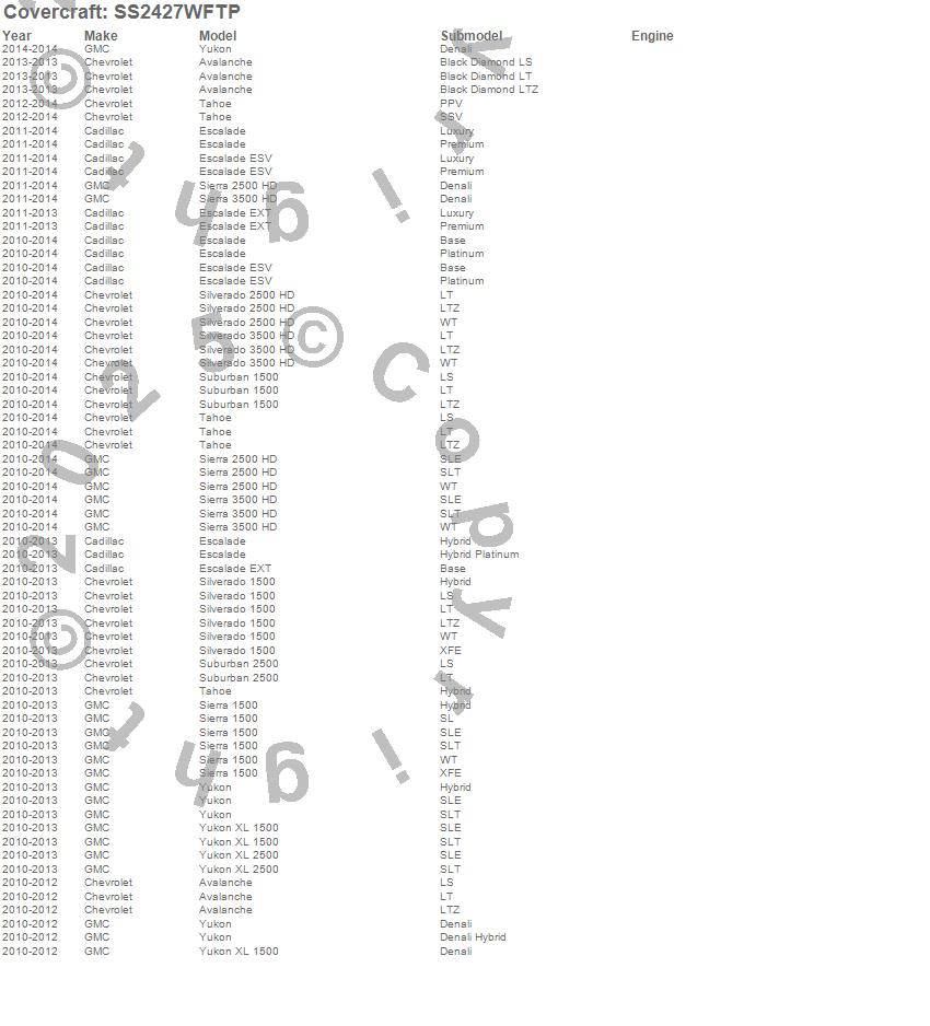 Below is an abbreviated list of applications for the SeatSaver Custom Seat Cover.Avalanche, Escalade, Escalade ESV, Escalade EXT, Sierra 1500, Sierra 2500 HD, Sierra 3500 HD, Silverado 1500, Silverado 2500 HD, Silverado 3500 HD, Suburban 1500, Suburban 2500, Tahoe, Yukon, Yukon XL 1500, Yukon XL 2500, Cadillac, Chevrolet, GMC, 2014