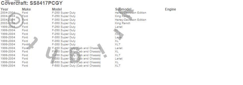 Below is an abbreviated list of applications for the SeatSaver Custom Seat Cover.F-250 Super Duty, F-350 Super Duty, F-450 Super Duty, F-550 Super Duty, Ford, 2004, 2003, 2002, 2001, 2000, 1999