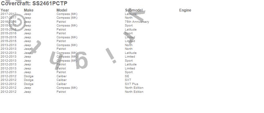 Below is an abbreviated list of applications for the SeatSaver Custom Seat Cover.Caliber, Compass, Patriot, Dodge, Jeep, 2017, 2016, 2015, 2013, 2012