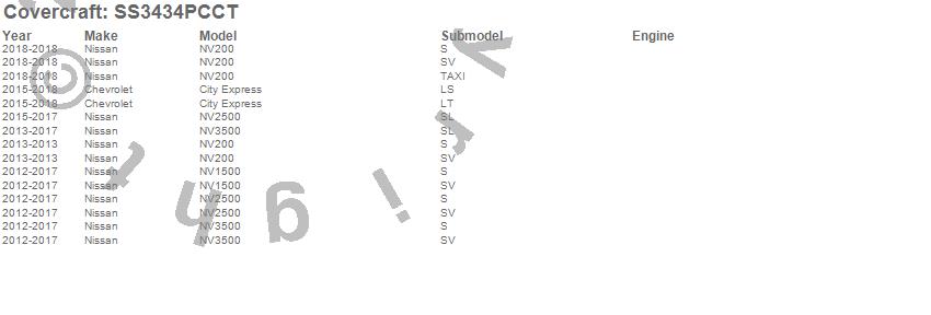 Below is an abbreviated list of applications for the SeatSaver Custom Seat Cover.City Express, NV1500, NV200, NV2500, NV3500, Chevrolet, Nissan, 2018, 2017, 2016, 2015, 2014, 2013, 2012