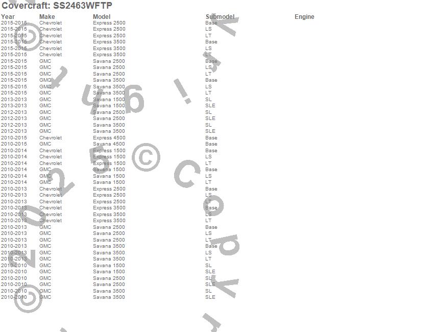 Below is an abbreviated list of applications for the SeatSaver Custom Seat Cover.Express 1500, Express 2500, Express 3500, Express 4500, Savana 1500, Savana 2500, Savana 3500, Savana 4500, Chevrolet, GMC, 2015, 2014, 2013, 2012, 2011, 2010