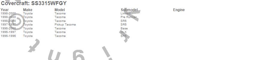 Below is an abbreviated list of applications for the SeatSaver Custom Seat Cover.Tacoma, Toyota, 2000, 1999, 1998, 1997, 1996