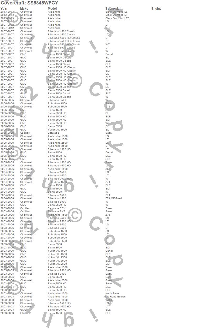 Below is an abbreviated list of applications for the SeatSaver Custom Seat Cover.Avalanche, Avalanche 1500, Avalanche 2500, Escalade, Escalade ESV, Escalade EXT, Sierra 1500, Sierra 1500 Classic, Sierra 1500 HD, Sierra 1500 HD Classic, Sierra 2500 HD, Sierra 2500 HD Classic, Sierra 3500, Sierra 3500 Classic, Silverado 1500, Silverado 1500 Classic, Silverado 1500 HD, Silverado 1500 HD Classic, Silverado 2500 HD, Silverado 2500 HD Classic