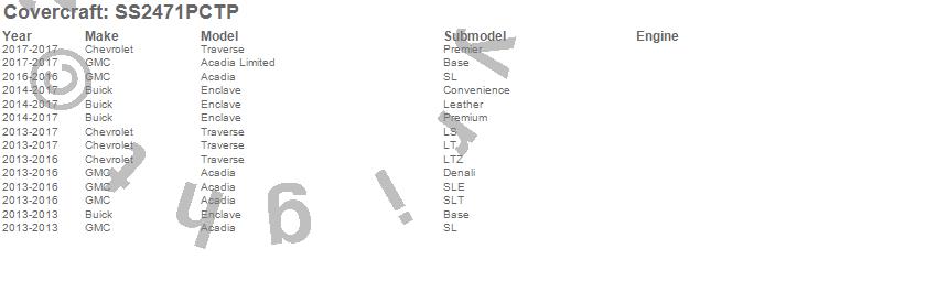 Below is an abbreviated list of applications for the SeatSaver Custom Seat Cover.Acadia, Acadia Limited, Enclave, Traverse, Buick, Chevrolet, GMC, 2017, 2016, 2015, 2014, 2013