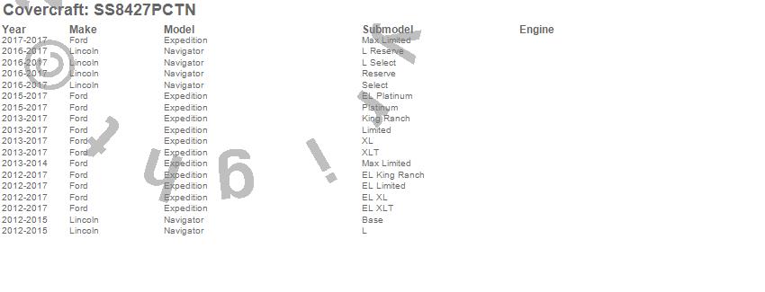 Below is an abbreviated list of applications for the SeatSaver Custom Seat Cover.Expedition, Navigator, Ford, Lincoln, 2017, 2016, 2015, 2014, 2013, 2012