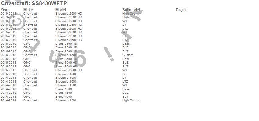 Below is an abbreviated list of applications for the SeatSaver Custom Seat Cover.Sierra 1500, Sierra 2500 HD, Sierra 3500 HD, Silverado 1500, Silverado 2500 HD, Silverado 3500 HD, Chevrolet, GMC, 2019, 2018, 2017, 2016, 2015, 2014