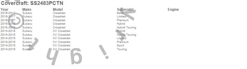 Below is an abbreviated list of applications for the SeatSaver Custom Seat Cover.Crosstrek, XV Crosstrek, Subaru, 2017, 2016, 2015, 2014