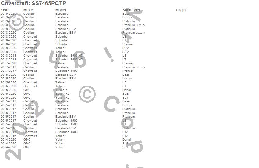 Below is an abbreviated list of applications for the SeatSaver Custom Seat Cover.Escalade, Escalade ESV, Suburban, Suburban 1500, Suburban 3500 HD, Tahoe, Yukon, Yukon XL, Cadillac, Chevrolet, GMC, 2020, 2019, 2018, 2017, 2016, 2015, 2014