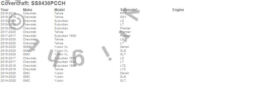Below is an abbreviated list of applications for the SeatSaver Custom Seat Cover.Suburban, Suburban 1500, Tahoe, Yukon, Yukon XL, Chevrolet, GMC, 2020, 2019, 2018, 2017, 2016, 2015, 2014