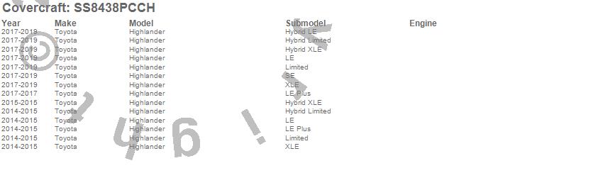 Below is an abbreviated list of applications for the SeatSaver Custom Seat Cover.Highlander, Toyota, 2019, 2018, 2017, 2015, 2014