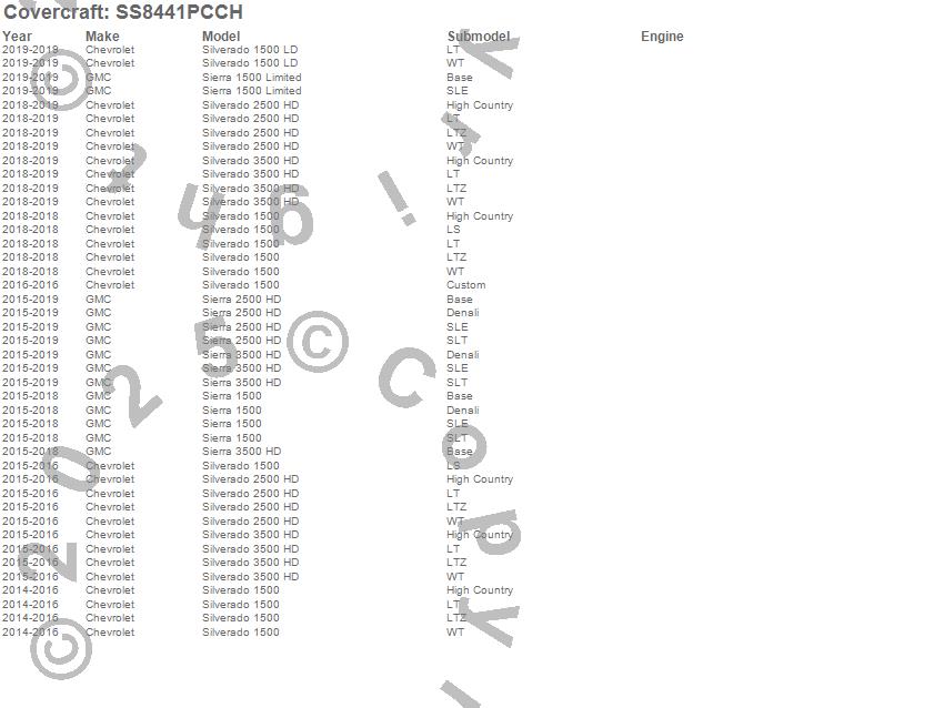 Below is an abbreviated list of applications for the SeatSaver Custom Seat Cover.Sierra 1500, Sierra 1500 Limited, Sierra 2500 HD, Sierra 3500 HD, Silverado 1500, Silverado 1500 LD, Silverado 2500 HD, Silverado 3500 HD, Chevrolet, GMC, 2019, 2018, 2017, 2016, 2015, 2014