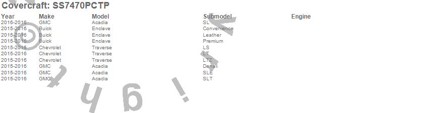 Below is an abbreviated list of applications for the SeatSaver Custom Seat Cover.Acadia, Enclave, Traverse, Buick, Chevrolet, GMC, 2016, 2015