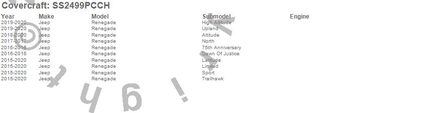 Below is an abbreviated list of applications for the SeatSaver Custom Seat Cover.Renegade, Jeep, 2020, 2019, 2018, 2017, 2016, 2015
