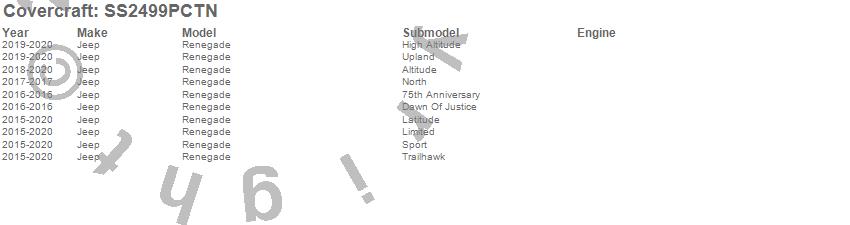 Below is an abbreviated list of applications for the SeatSaver Custom Seat Cover.Renegade, Jeep, 2020, 2019, 2018, 2017, 2016, 2015