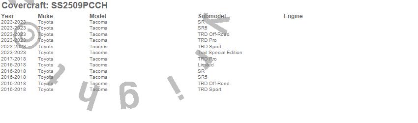 Below is an abbreviated list of applications for the SeatSaver Custom Seat Cover.Tacoma, Toyota, 2023, 2018, 2017, 2016
