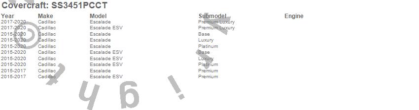 Below is an abbreviated list of applications for the SeatSaver Custom Seat Cover.Escalade, Escalade ESV, Cadillac, 2020, 2019, 2018, 2017, 2016, 2015